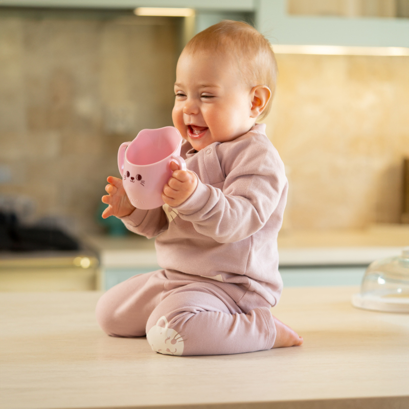 Kubek z uchwytami dla dzieci do nauki samodzielnego picia to bez wątpienia wspaniała zachęta do picia wody oraz innych napojów i wyrabiania prawidłowych nawyków. Jest lekki i poręczny, zaprojektowany idealnie do dziecięcych dłoni. Dzieci podpatrując dorosłych chcą korzystać z podobnych naczyń, dlatego nasz kubek to świetne rozwiązanie. Ścięta krawędź kubka ułatwia dziecku picie, dzięki czemu nie musi ono odchylać głowy do tyłu, co zmniejsza ryzyko zakrztuszenia. Kubek jest wykonany z nietłukącego się i bezpiecznego plastiku, nie zawiera BPA ani innych szkodliwych substancji. Jest wytrzymały, lekki i odporny na uszkodzenia. Można go myć go w zmywarce. Przeznaczony do napojów zimnych lub w temperaturze pokojowej. Rekomendowany dla dzieci od 6 miesiąca życia.