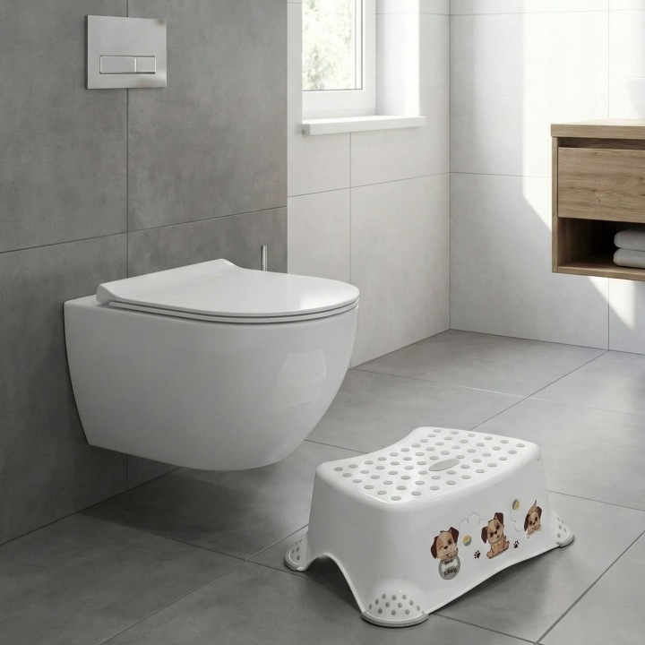 Podest pomaga dziecku już od najmłodszych lat dosięgnąć toalety, umywalki, stołu itp. Jest praktyczny, lekki oraz bezpieczny. Charakterystyczną cechą produktu jest antypoślizgowa gumowa powierzchnia na wierzchu oraz przy nóżkach stołka, dzięki której dziecko czuje się stabilnie podczas wykonywania codziennych czynności. Dzięki antypoślizgowym krawędziom jest stabilny i bezpieczny. Przydatny nie tylko w łazience, ale wszędzie gdzie potrzebne jest bezpieczne podwyższenia.