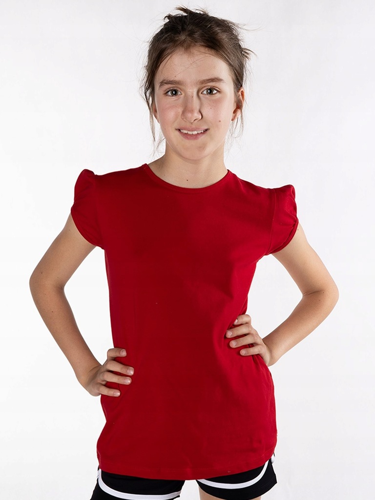 Dziewczęca koszulka w kolorze czerwonym. Posiada klasyczny, okrągły dekolt oraz krótkie rękawki z delikatnym marszczeniem. Delikatne taliowanie sprawia, że koszulka zgrabnie leży na dziecku, jednocześnie go nie opinając.