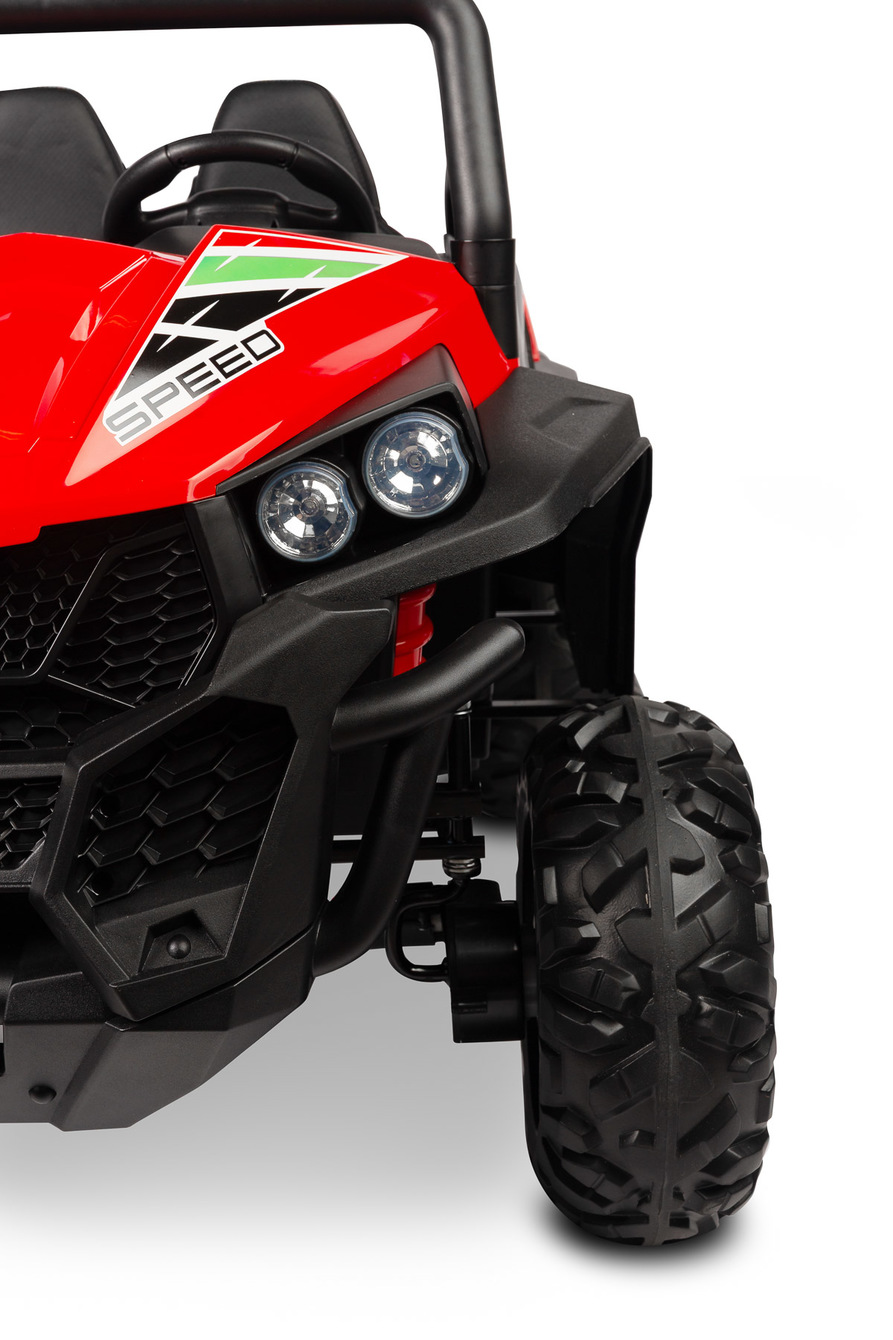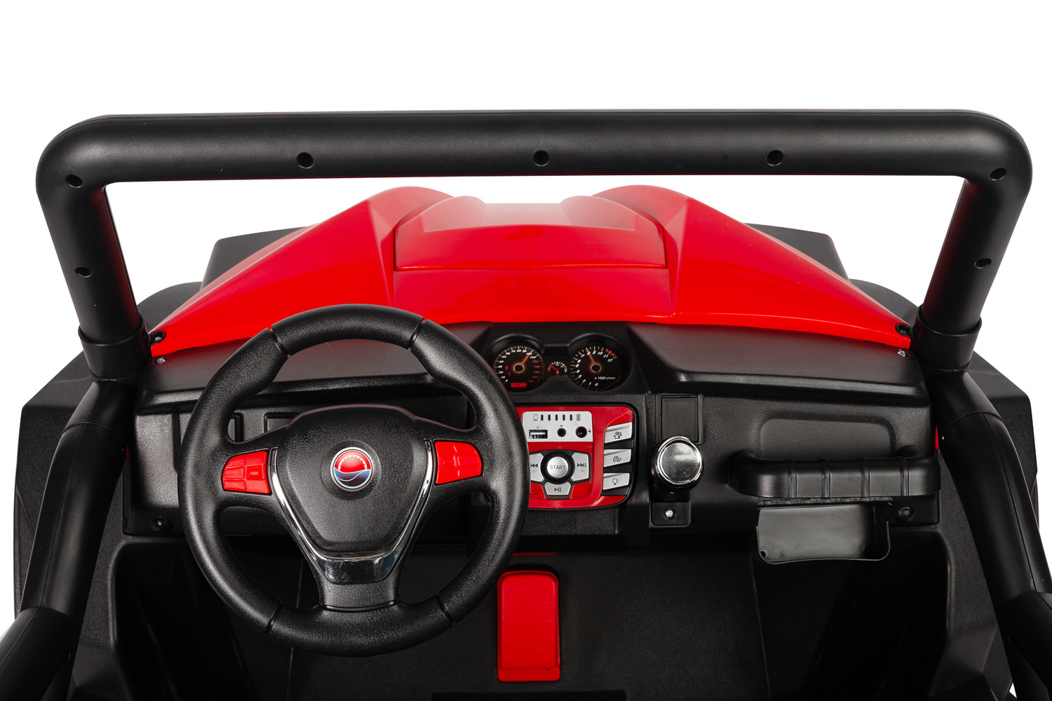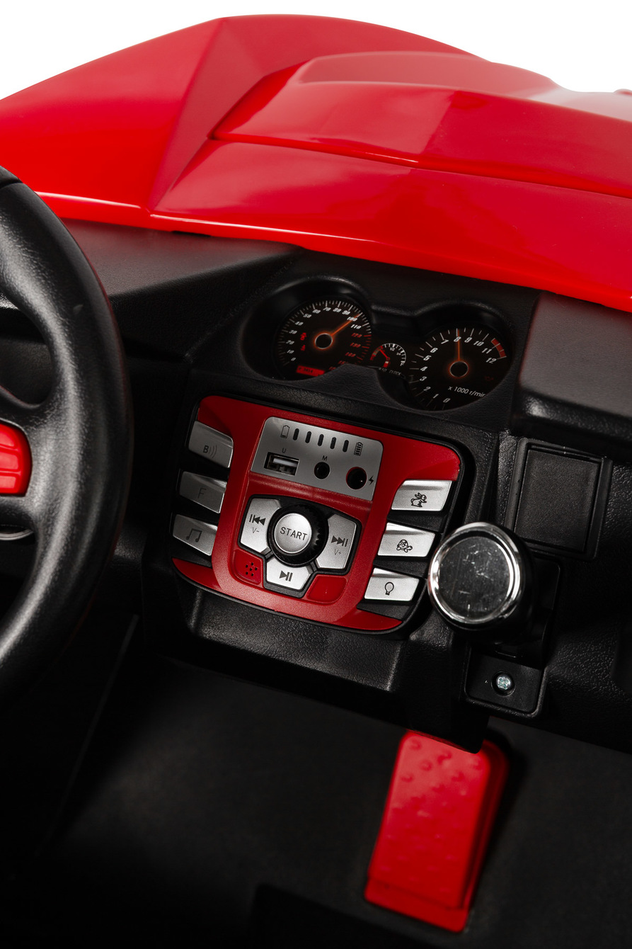 Kierownica z interaktywnymi dźwiękami, radio FM, Bluetooth oraz możliwość podłączenia muzyki przez USB i AUX zapewniają dzieciom prawdziwie multimedialne doświadczenie podczas jazdy. Grand Buggy posiada również efektowne oświetlenie - przednie światła uruchamiane są przyciskiem na kokpicie, a dodatkowe światła LED umieszczone na poprzeczce zasilane są bateriami. Dzięki temu jazda po zmroku staje się jeszcze bardziej ekscytująca i realistyczna.