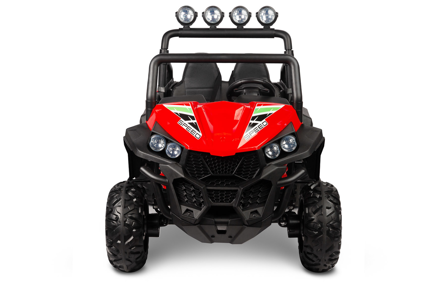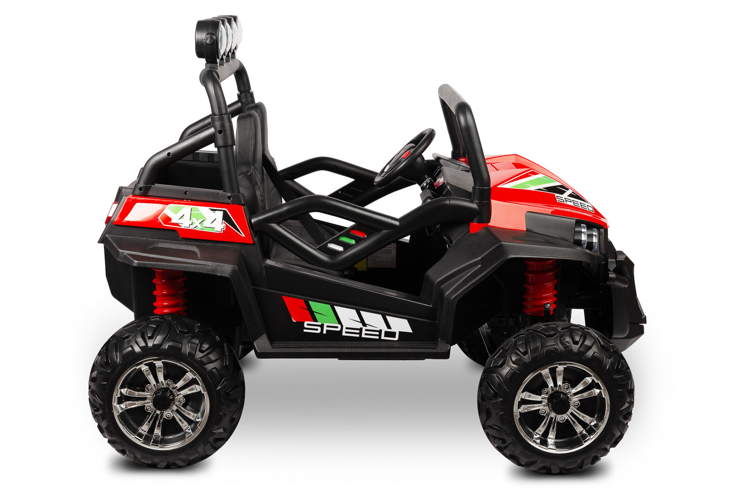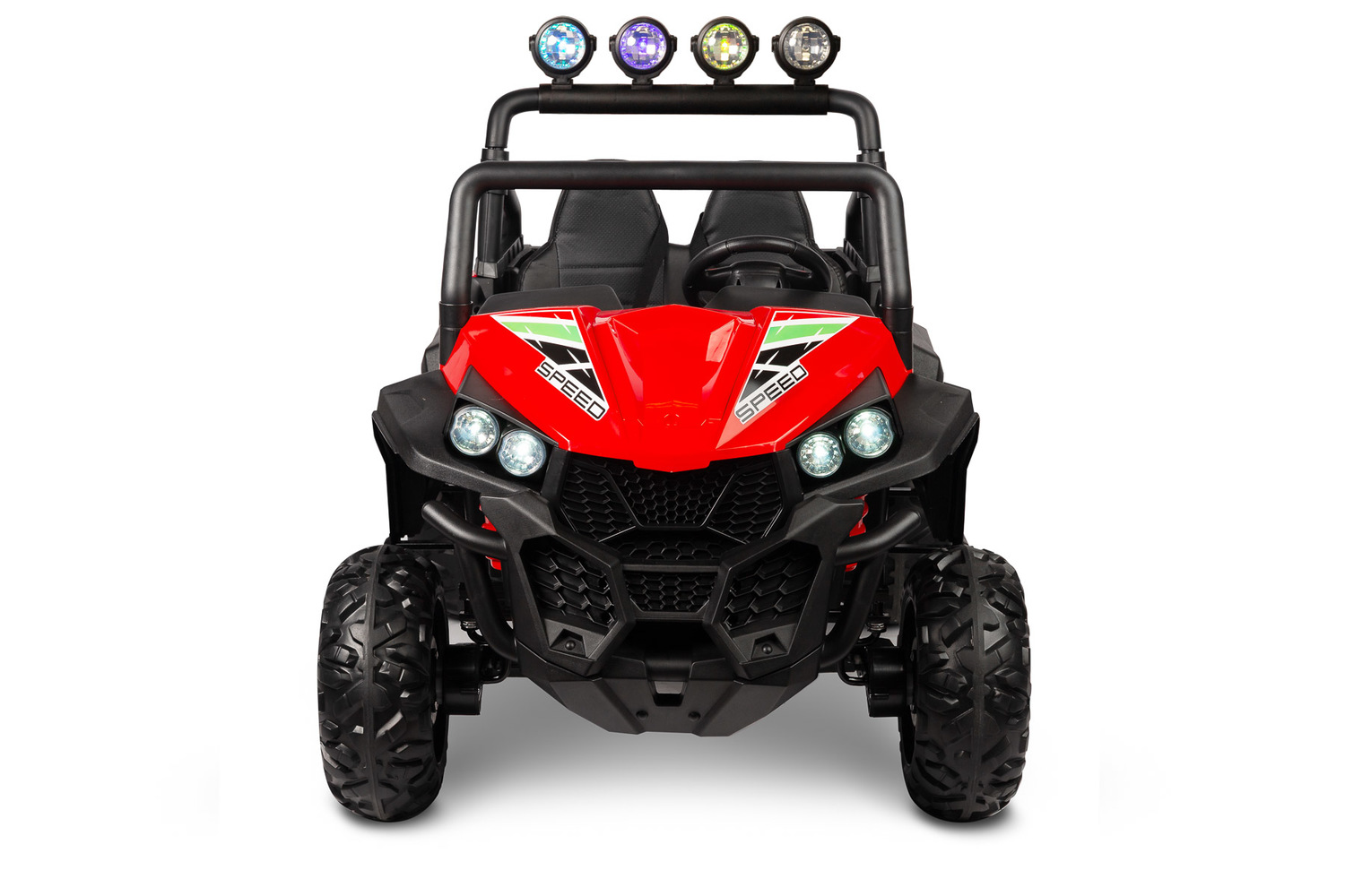 Kierownica z interaktywnymi dźwiękami, radio FM, Bluetooth oraz możliwość podłączenia muzyki przez USB i AUX zapewniają dzieciom prawdziwie multimedialne doświadczenie podczas jazdy. Grand Buggy posiada również efektowne oświetlenie - przednie światła uruchamiane są przyciskiem na kokpicie, a dodatkowe światła LED umieszczone na poprzeczce zasilane są bateriami. Dzięki temu jazda po zmroku staje się jeszcze bardziej ekscytująca i realistyczna.