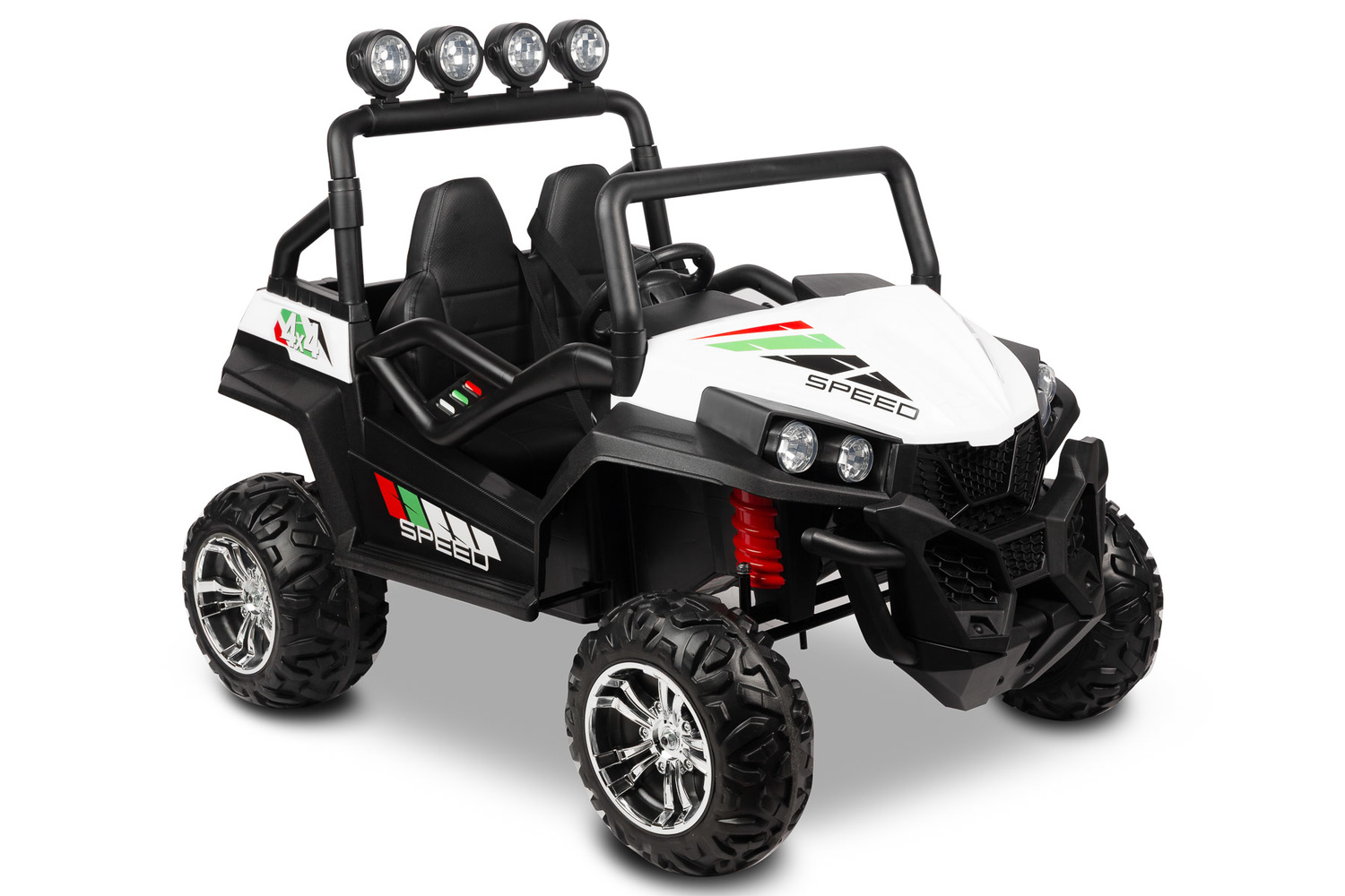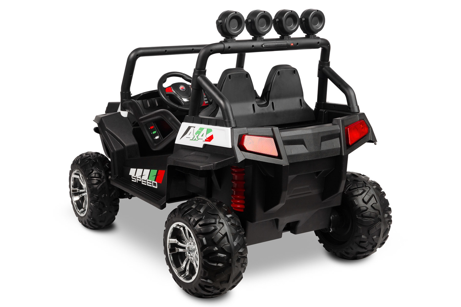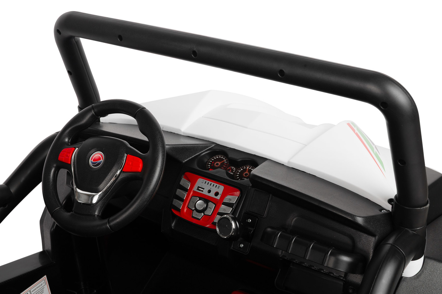 Kierownica z interaktywnymi dźwiękami, radio FM, Bluetooth oraz możliwość podłączenia muzyki przez USB i AUX zapewniają dzieciom prawdziwie multimedialne doświadczenie podczas jazdy. Grand Buggy posiada również efektowne oświetlenie - przednie światła uruchamiane są przyciskiem na kokpicie, a dodatkowe światła LED umieszczone na poprzeczce zasilane są bateriami. Dzięki temu jazda po zmroku staje się jeszcze bardziej ekscytująca i realistyczna.