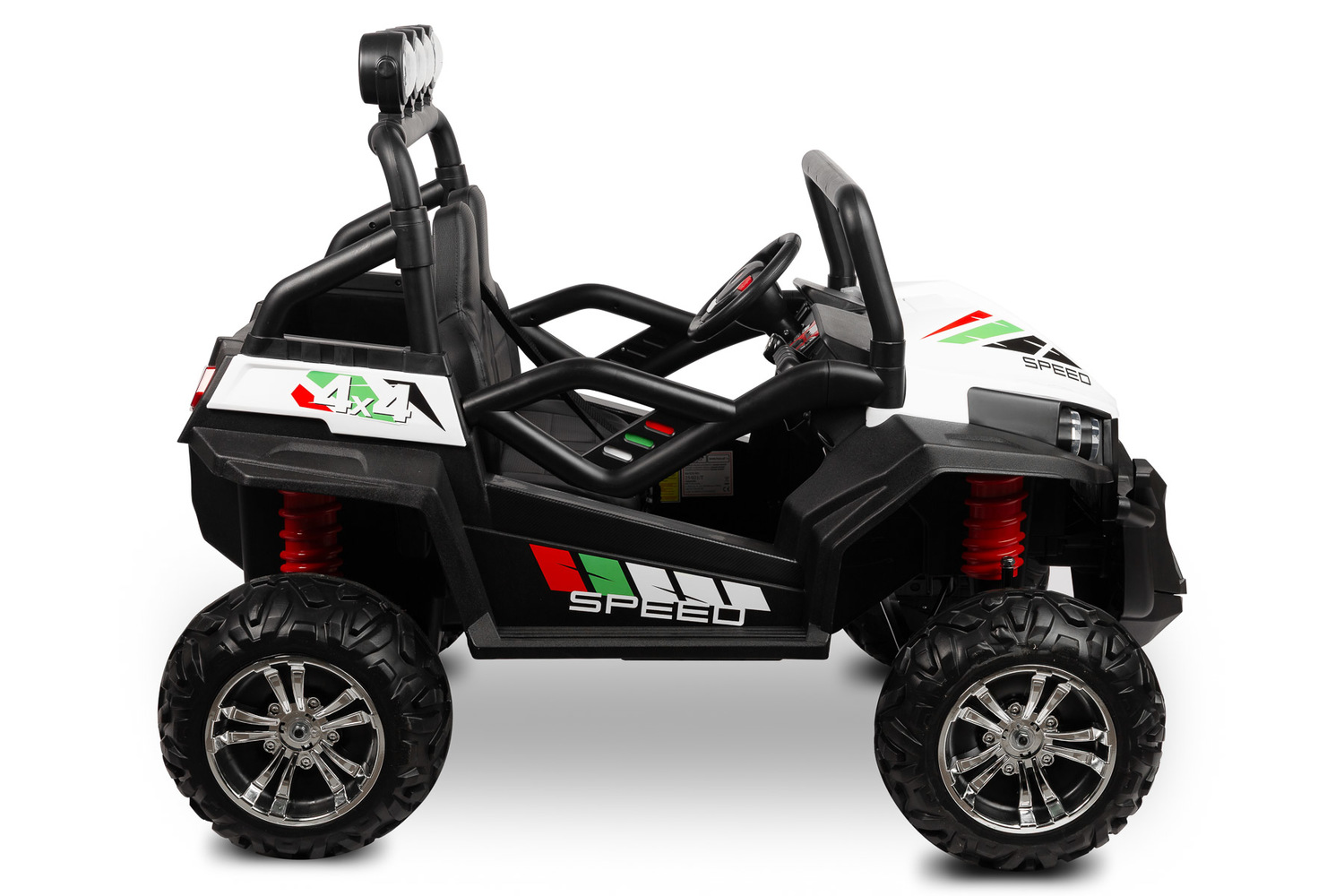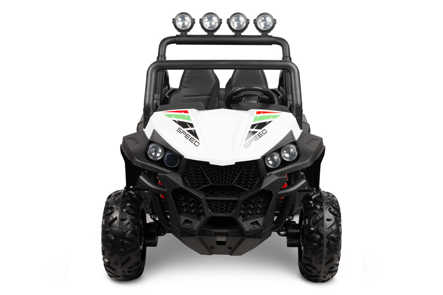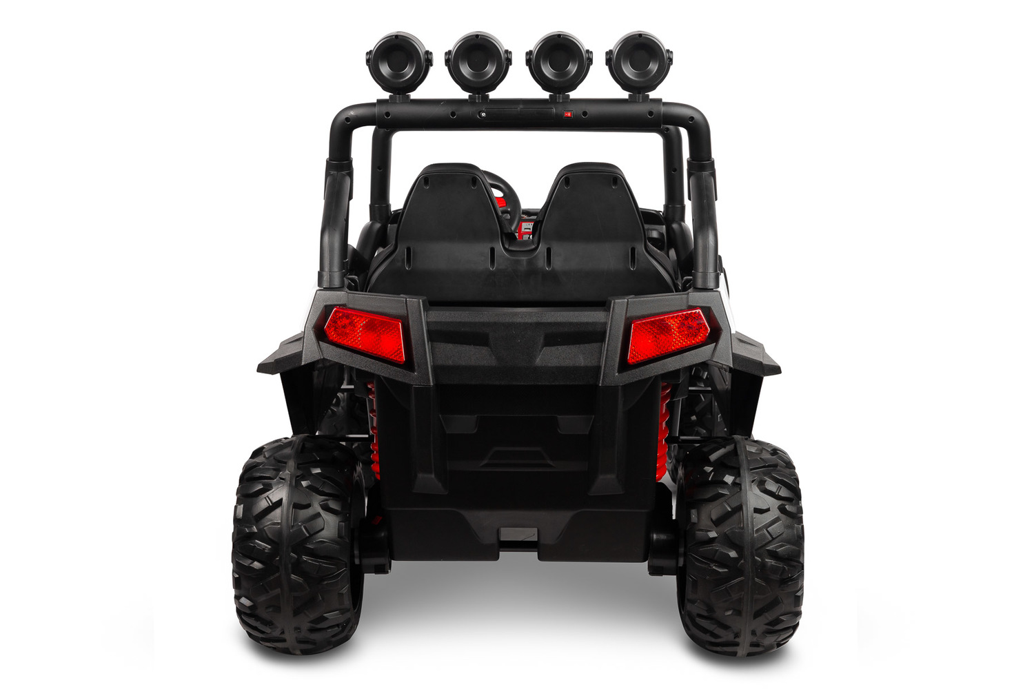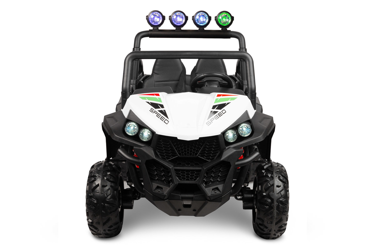 Kierownica z interaktywnymi dźwiękami, radio FM, Bluetooth oraz możliwość podłączenia muzyki przez USB i AUX zapewniają dzieciom prawdziwie multimedialne doświadczenie podczas jazdy. Grand Buggy posiada również efektowne oświetlenie - przednie światła uruchamiane są przyciskiem na kokpicie, a dodatkowe światła LED umieszczone na poprzeczce zasilane są bateriami. Dzięki temu jazda po zmroku staje się jeszcze bardziej ekscytująca i realistyczna.