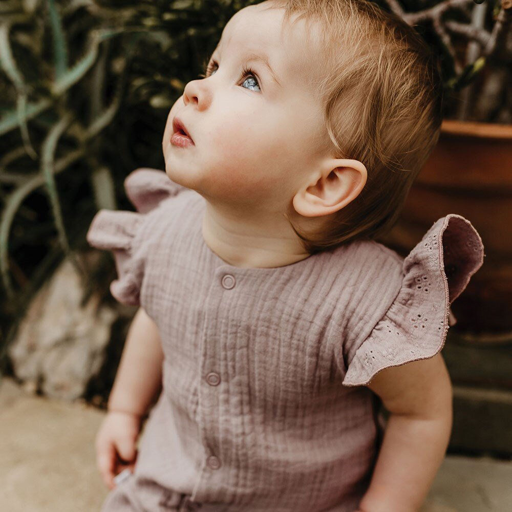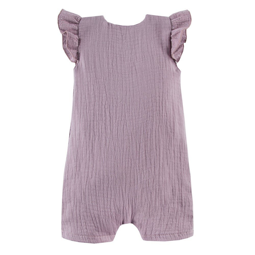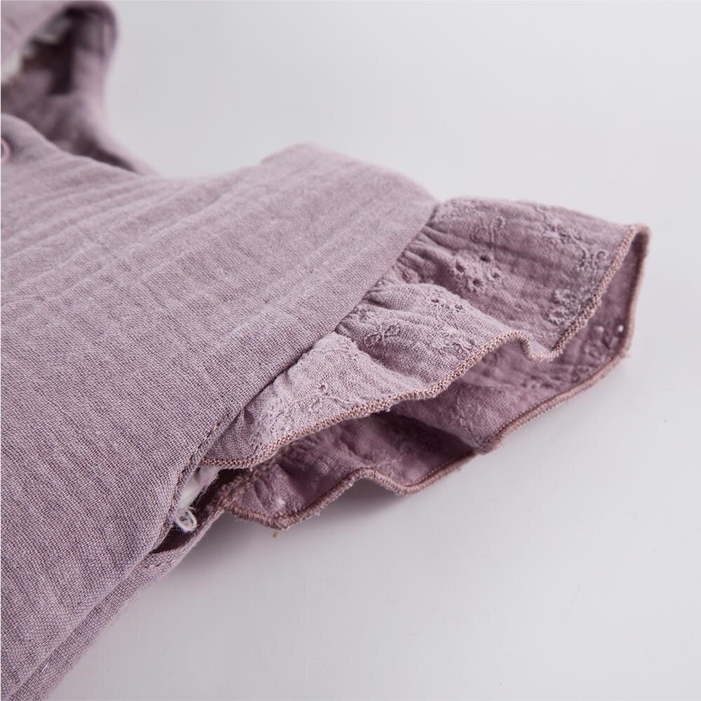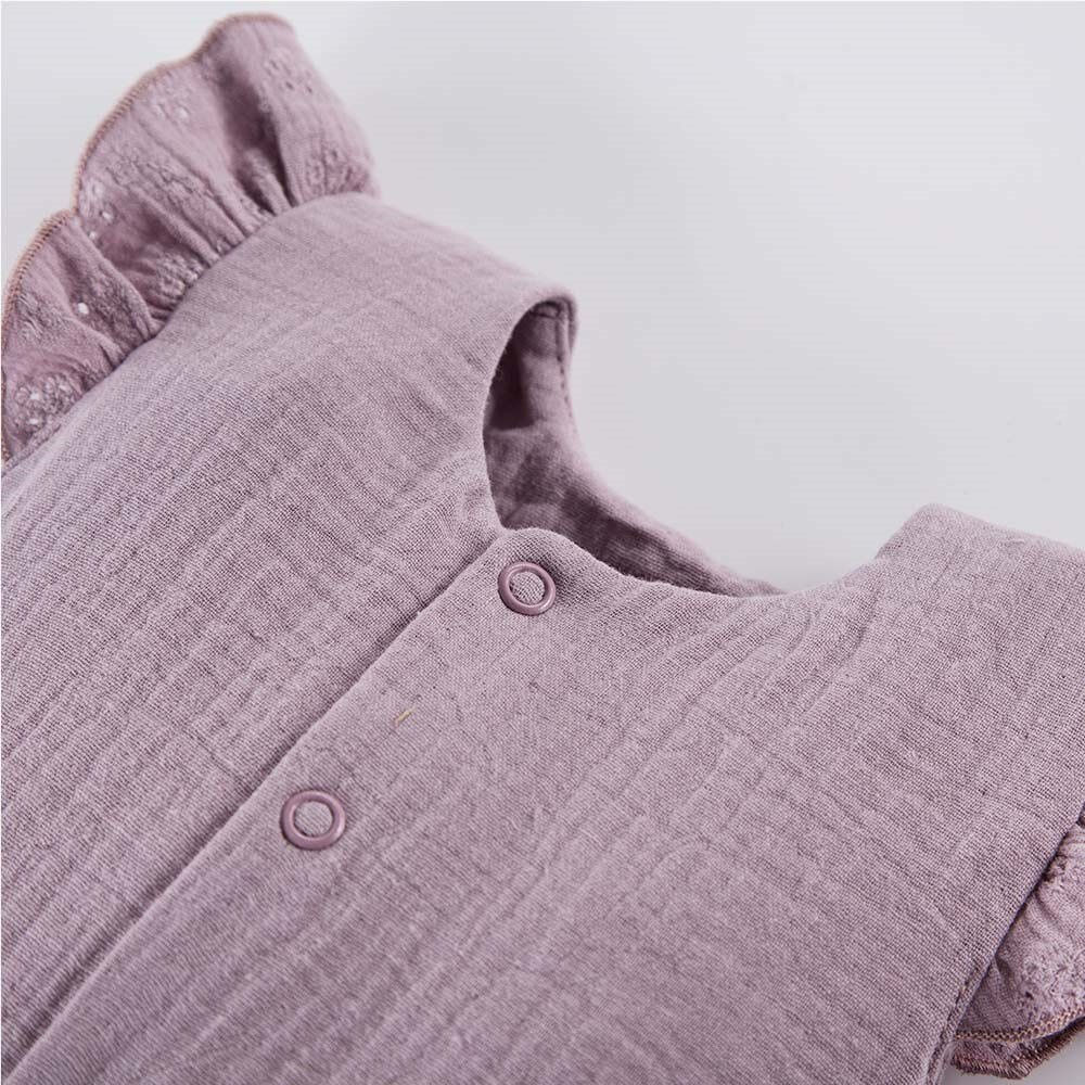 Rampers dziecięcy z falbankami z kolekcji Botanic uszyty z miękkiej i przyjemnej w dotyku tkaniny muślinowej. Rampers rozpinany jest na całej długości. Elementem ozdodnym są falbany wykonane z ażurowej tkaniny. Rampersy będą strzałem w dziesiątkę podczas szaleństw na plaży, ale również sprawdzi się jako ubranko wyjściowe na różne okazje.