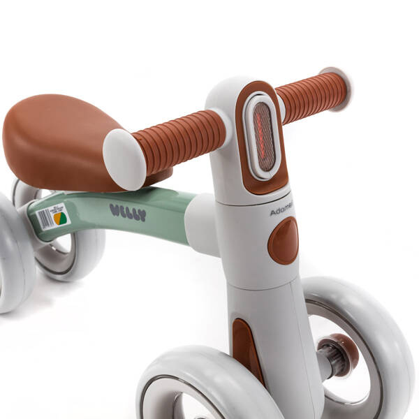 Wellyto 4-kołowy rowerek biegowy dla maluszków od 12-24 miesiąca życia, więc idealnie sprawdzi się jako pierwszy jeździk. Maluch porusza się na rowerku odpychając się nogami od ziemi, przez co rozwija swoją koordynację ruchową, równowagę oraz motorykę. Przemieszczanie się na rowerku Welly to nie tylko świetna zabawa, ale również forma aktywności fizycznej. Jeśli Twój maluch postawił już pierwsze kroki to znak, że jest już gotowy na przejażdżki na rowerku Welly! • Stabilna konstrukcja i podwójne kółka z przodu i z tyłu zapewniają komfort wsiadania i zsiadania z rowerka • Koła wykonane są z pianki EVA, a ich średnica wynosi 15,5 cm • Blokada skrętu kierownicy dodatkowo wpływa na bezpieczeństwo pierwszych przejażdżek Twojego dziecka • Rowerek posiada również wbudowane światełko w kierownicy z 3 trybami świecenia. Do uruchomienia światełka potrzebujesz 2 x baterii AAA • Konstrukcja jest stalowa i stabilna, a to wszystko z wagą produktu wynoszącą tylko 2,15 kg! • Welly występuje w 4 pięknych, pastelowych zestawieniach kolorystycznych! • Maksymalne obciążenie rowerka to 25 kg