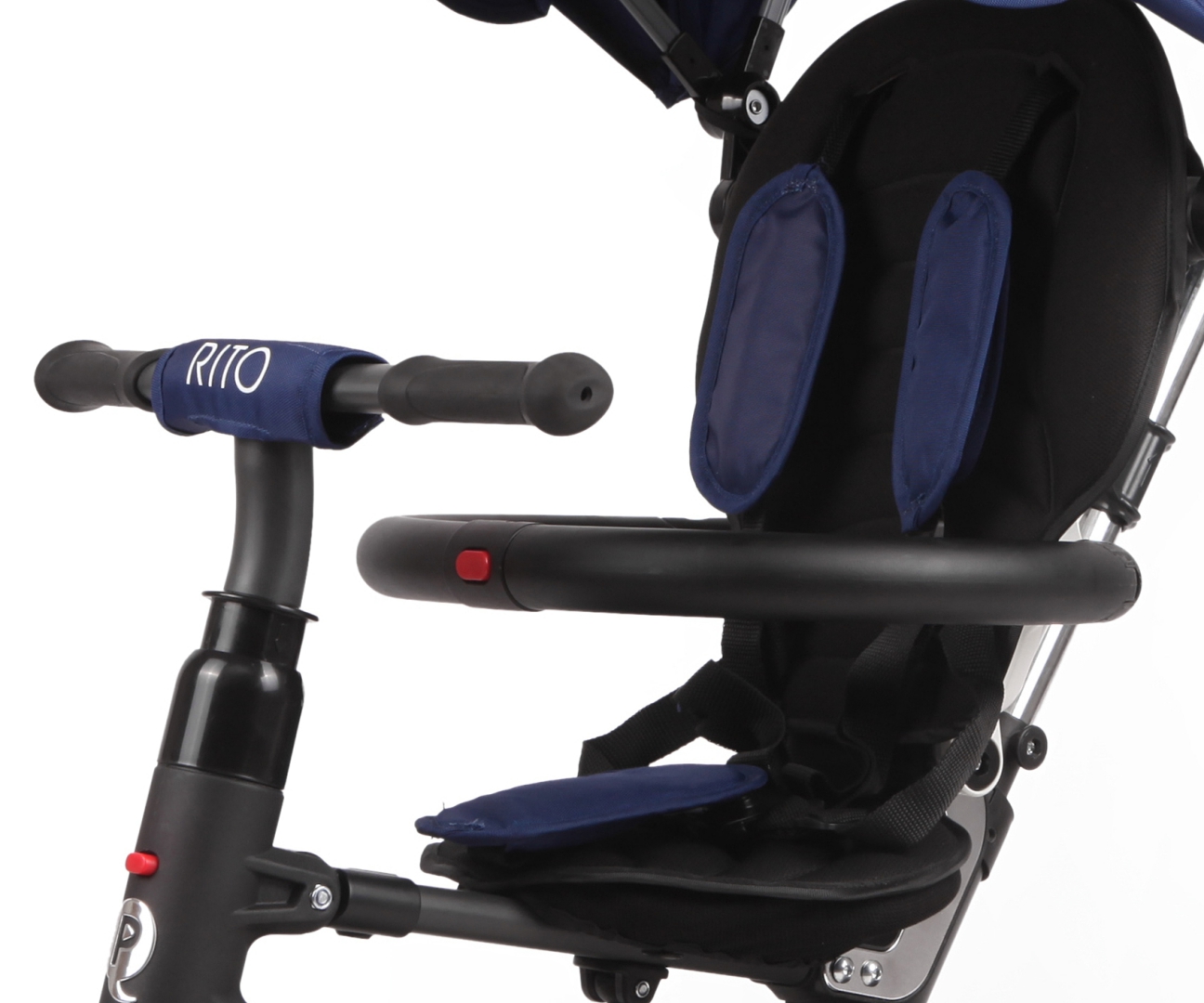 RITO jest stabilny i bezpieczny, posiada nowoczesną konstrukcję i wygodne wyprofilowane siedzisko. Rowerek został wyposażony w barierkę zabezpieczająca dziecko przed wypadnięciem, pięciopunktowe pasy bezpieczeństwa oraz podnóżek, a piankowe koła umożliwiają cichą i komfortową jazdę. Po zdemontowaniu rączki, barierek, budki i pokrowca na siedzisko RITO będzie służył jako rowerek trójkołowy. Dzięki funkcji „wolnego koła i kierownicy” dziecko może swobodnie pedałować i skręcać, a rączka dla rodzica nadal może korygować prędkość i kierunek przemieszczania.