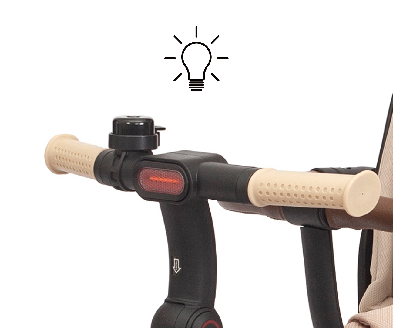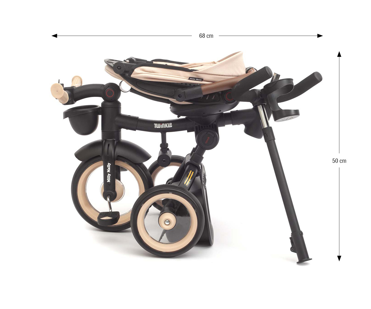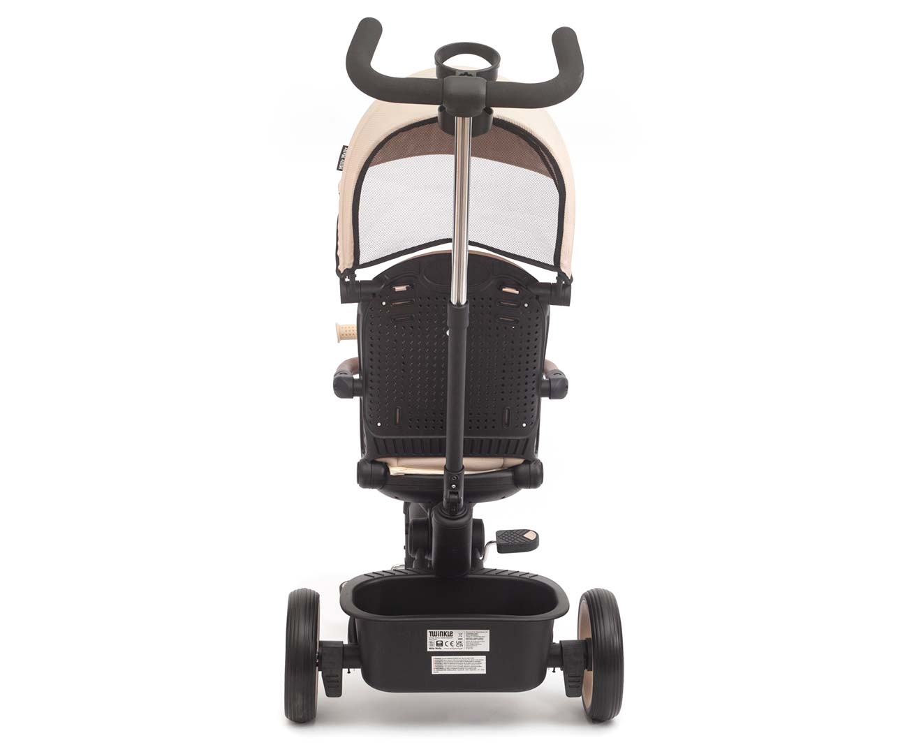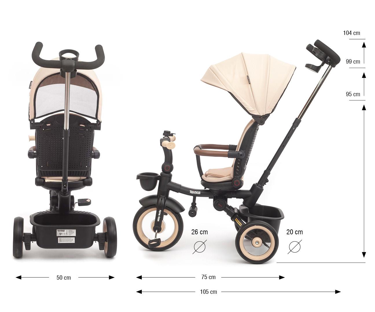 Wyposażony w regulowaną rączkę do prowadzenia, funkcję wolnego koła, hamulec, a także pasy bezpieczeństwa z osłonkami i wygodne oparcie z trzystopniową regulacją - Twinkle gwarantuje pełną kontrolę i wygodę dla dziecka i rodzica. Lekka, ale wytrzymała stalowa rama, piankowe, łożyskowane koła, składana konstrukcja oraz praktyczne dodatki, jak budka z siateczką, światło LED, uchwyt na napój, i 2 kufereki, sprawiają, że to idealny wybór na każdą okazję – w mieście, na spacerze czy w podróży. Po zdemontowaniu rączki do pchania, barierek i budki Twinkle będzie służył jako klasyczny rowerek trójkołowy.