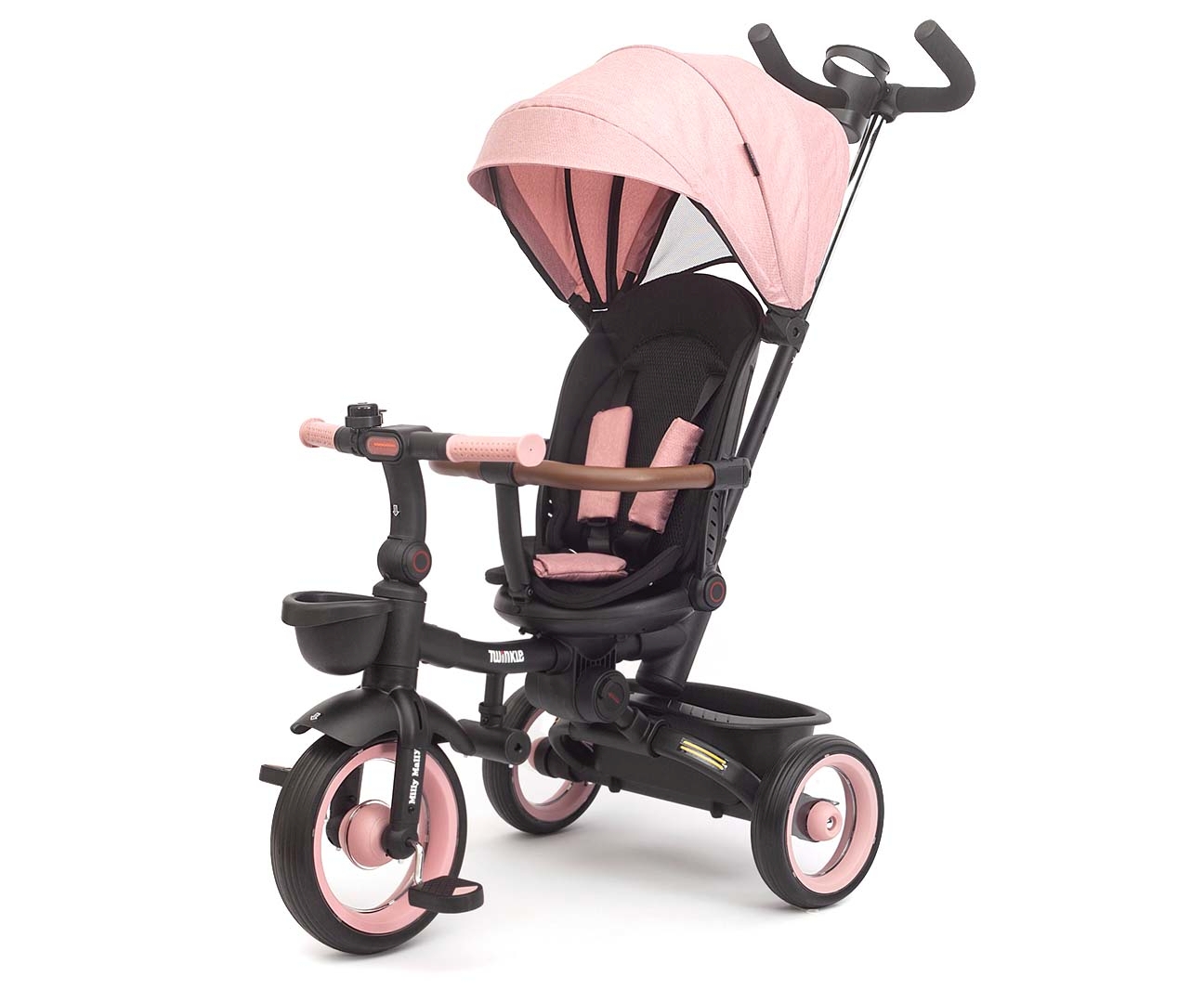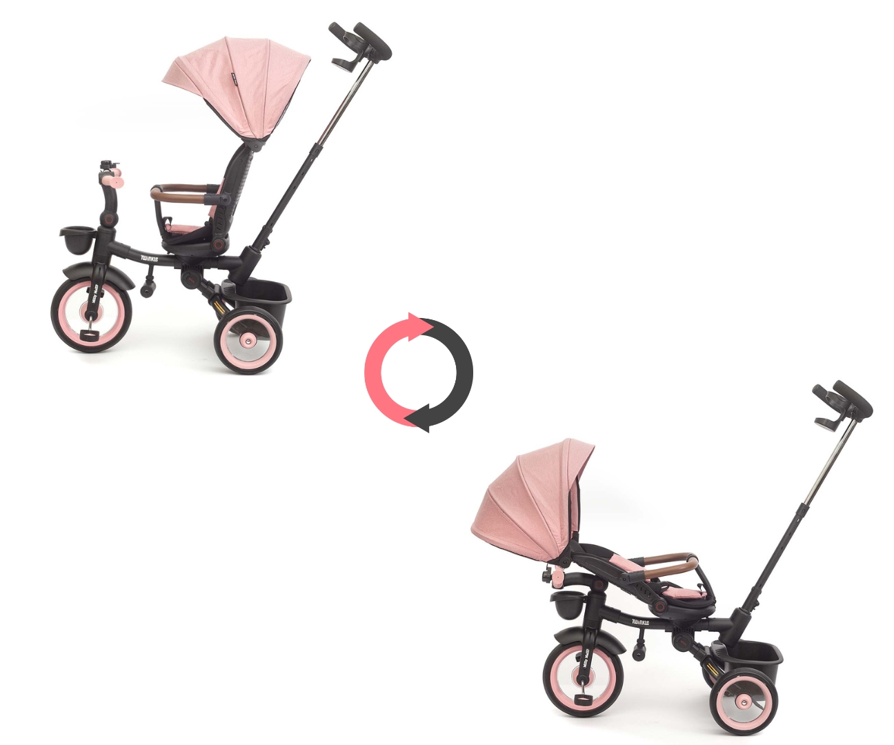 Rowerek trójkołowy Twinkle to połączenie komfortu wózka z funkcjonalnością rowerka – stworzony z myślą o dzieciach od 12. miesiąca życia. Dzięki obracanemu o 180° siedzisku maluch może podróżować zarówno przodem, jak i tyłem do kierunku jazdy.