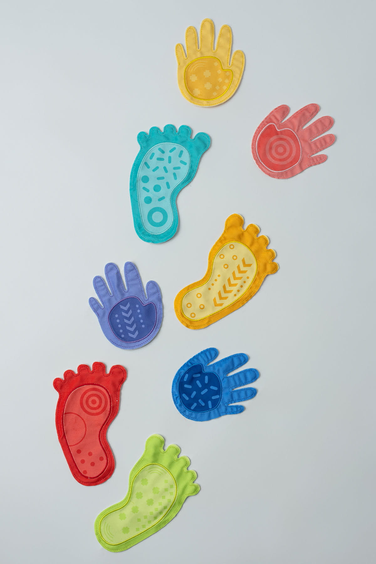 Ścieżka sensoryczna Tup Tup to zabawka edukacyjna, składająca się z dwóch par stóp i dłoni wykonanych z przyjemnego welurku, wypełnionych naturalnymi materiałami takimi jak łuska gryki, siemię lniane, pestka wiśni, ryż, soja, kasza gryczana, kasza jaglana, oraz groch.