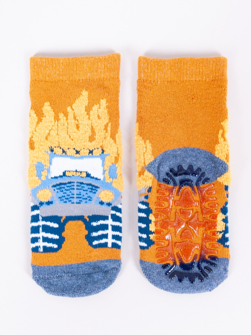 Chłopięce skarpety w wesołych kolorach, pasujących do wielu stylizacji, z motywem zwierzątek i pojazdów. Dodatkową ozdobą są elementy 3D: grzywa lwa, światła policyjne, płomienie czy wysypywana ziemia przez koparkę. Wykonane są ze splotu frotte, co zapewnia stopie odpowiedni komfort cieplny. Skarpety są miłe w dotyku, posiadają nieupijający ściągacz. Na spodniej stronie znajduje się antypoślizgowa aplikacja w postaci silikonowej warstwy, która gwarantuje dobrą przyczepność do podłogi. Dzięki temu Twoje dziecko będzie mogło bezpiecznie poruszać się nawet po śliskich powierzchniach.