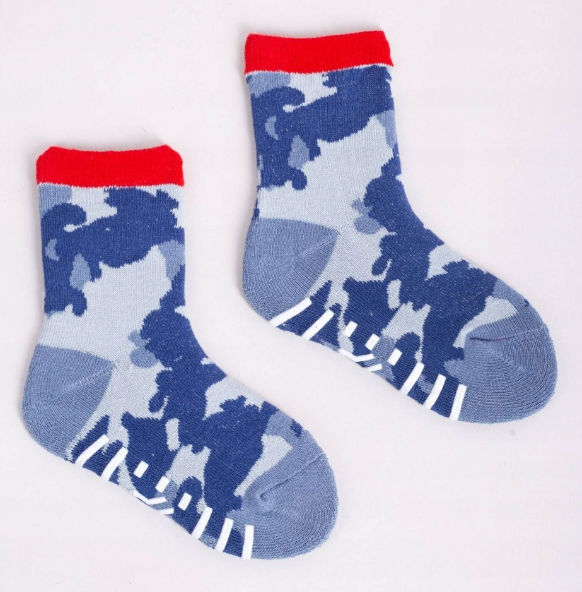 W typowo chłopięcych kolorach i wzorach. Skarpety są miłe w dotyku, posiadają nieupijający ściągacz. Na spodniej stronie wykonane są ze splotu frotte, co zapewnia stopie odpowiedni komfort cieplny. Dodatkowo posiadają antypoślizgową aplikację w postaci pasków, która gwarantuje dobrą przyczepność do podłogi. Dzięki temu Twoje dziecko będzie mogło bezpiecznie poruszać się nawet po śliskich powierzchniach.