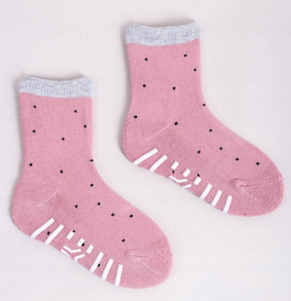 W typowo dziewczęcych kolorach i wzorach. Skarpety są miłe w dotyku, posiadają nieupijający ściągacz. Na spodniej stronie wykonane są ze splotu frotte, co zapewnia stopie odpowiedni komfort cieplny. Dodatkowo posiadają antypoślizgową aplikację w postaci pasków, która gwarantuje dobrą przyczepność do podłogi. Dzięki temu Twoje dziecko będzie mogło bezpiecznie poruszać się nawet po śliskich powierzchniach.