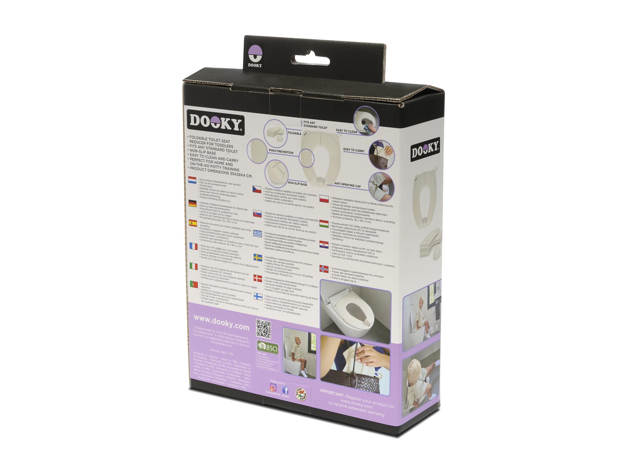 Nauka korzystania z toalety jest dużo łatwiejsza, gdy dziecko czuje się pewnie i komfortowo. Składana nakładka na toaletę Dooky pomaga maluchowi bezpiecznie usiąść na dużej toalecie, zapobiegając zsuwaniu się i zapewniając stabilne podparcie.