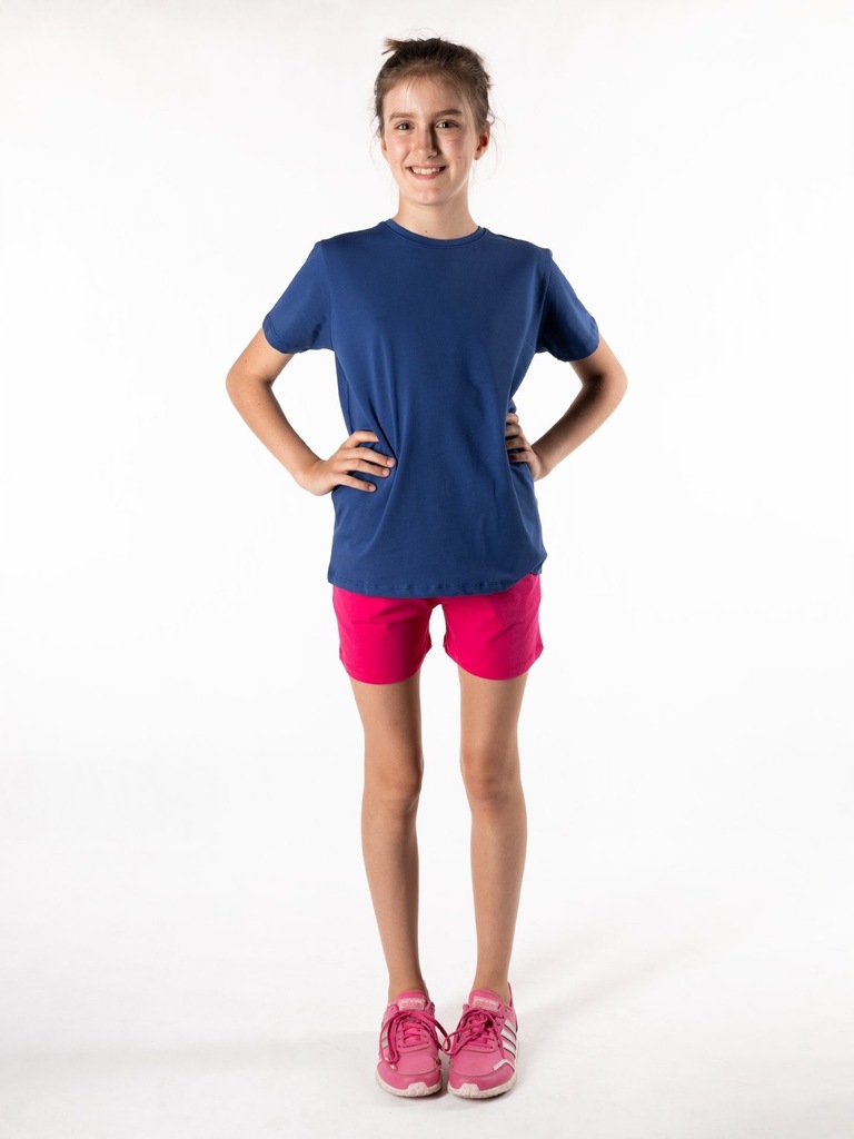 Dziewczęce, krótkie, dzianinowe spodenki w kolorze delikatnego różu. Posiadają dwie kieszonki. Dzięki ściągaczowi w pasie dobrze trzymają się ciała.