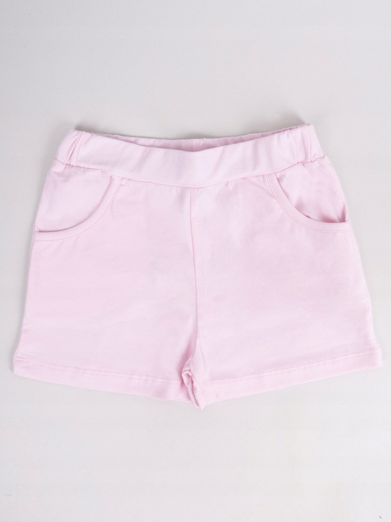 Dziewczęce, krótkie, dzianinowe spodenki w kolorze delikatnego różu. Posiadają dwie kieszonki. Dzięki ściągaczowi w pasie dobrze trzymają się ciała.