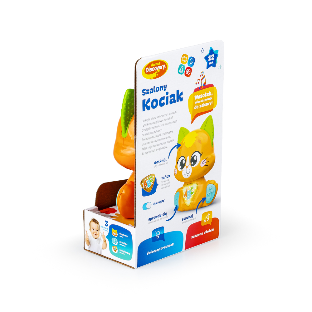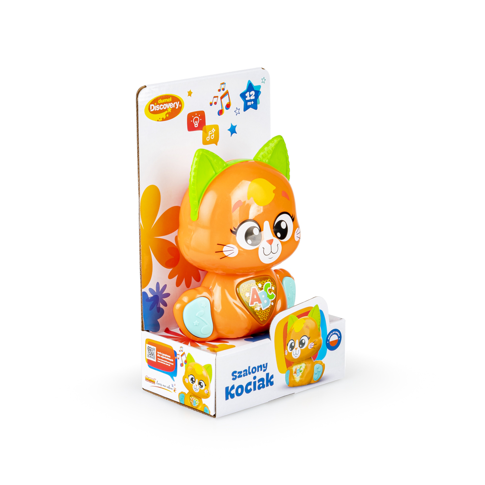 Zwariowany zwierzak kryje w sobie mnóstwo rozweselających dźwięków! Jego rozśpiewany brzuszek odtwarza wesołe piosenki, a uruchamiający je przycisk, świeci podczas odtwarzania dźwięków. Kotek posiada czujnik dotyku na czółku, dzięki czemu, podczas głaskania kotka po głowie, maluch usłyszy wesołe frazy, wypowiadane przez zwierzaka. Kocie łapki także zadbają o rozrywkę malucha! Przycisk na pierwszej z nich uruchamia tryb wyzwań, w którym kotek aktywizuje najmłodszych trzema propozycjami zabaw. Druga łapka uruchamia melodie. Kociak wyposażony został w praktyczny przełącznik ON/OFF, umożliwiający wyłączenie zwierzaka po zakończonej zabawie.