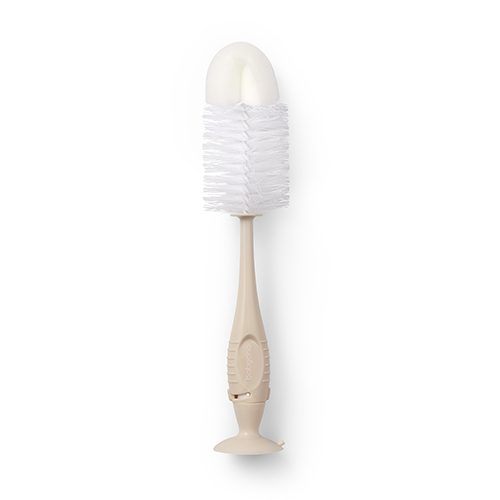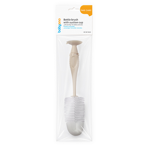 W uchwycie szczotki schowaliśmy małą szczoteczkę do precyzyjnego czyszczenia smoczka. Posiada przyssawkę, dzięki której przymocujesz ją do płaskich powierzchni. Łatwo wysuszysz i przechowasz szczotkę.
