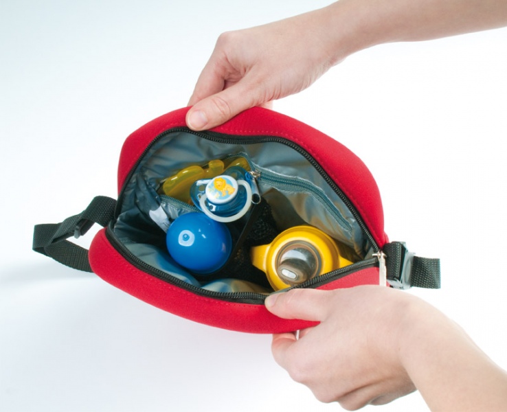 Wewnątrz: kieszeń z siatki utrzymująca butelkę/kubek w stałym miejscu oraz kieszeń na suwak na pieluszki lub mokre chusteczki
