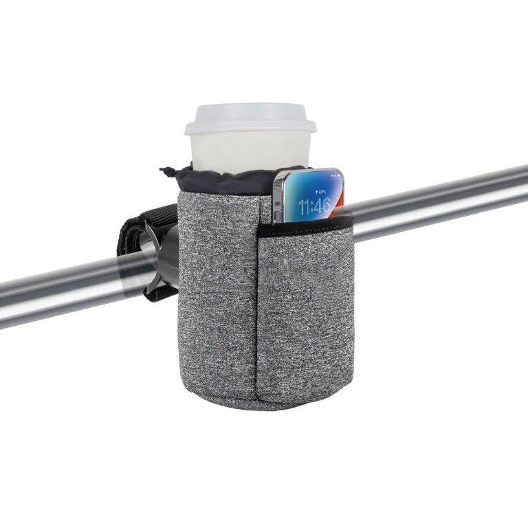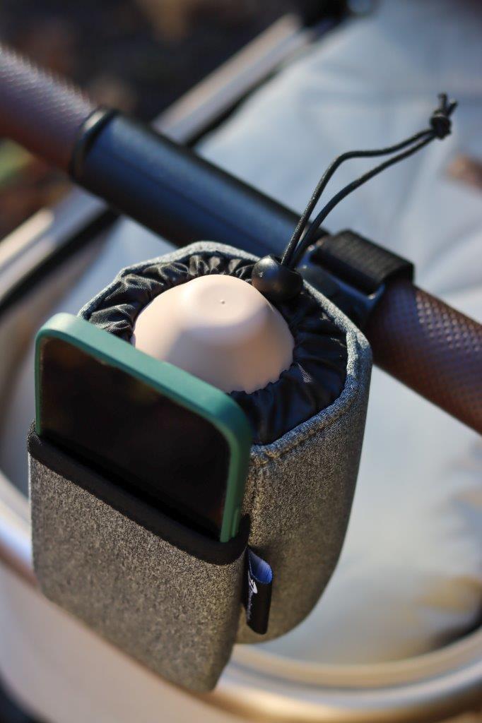 Uchwyt ten wyposażony jest w dodatkową kieszeń na telefon, co sprawia, że jest wygodny i praktyczny. Posiada uniwersalne mocowanie do rurki wózka lub roweru, które utrzymuje uchwyt stabilnie na miejscu i jest łatwe w założeniu. Uchwyt jest wszechstronny: na napoje i telefon nie tylko do wózka lub na kierownicę roweru, ale i innych pojazdów typu hulajnoga czy skuter.