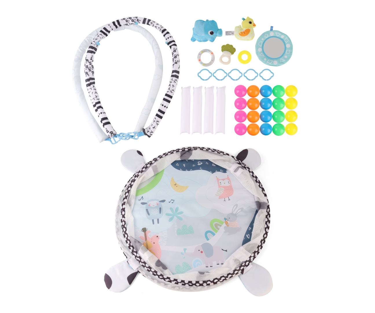 Podniesione ścianki z przewiewnej siatki przekształcają matę w bezpieczny mini-basen wypełniony 20 kolorowymi piłeczkami (w zestawie). Dziecko może bawić się w otoczeniu zabawek i miękkich ścianek, które zapewniają bezpieczeństwo i komfort.