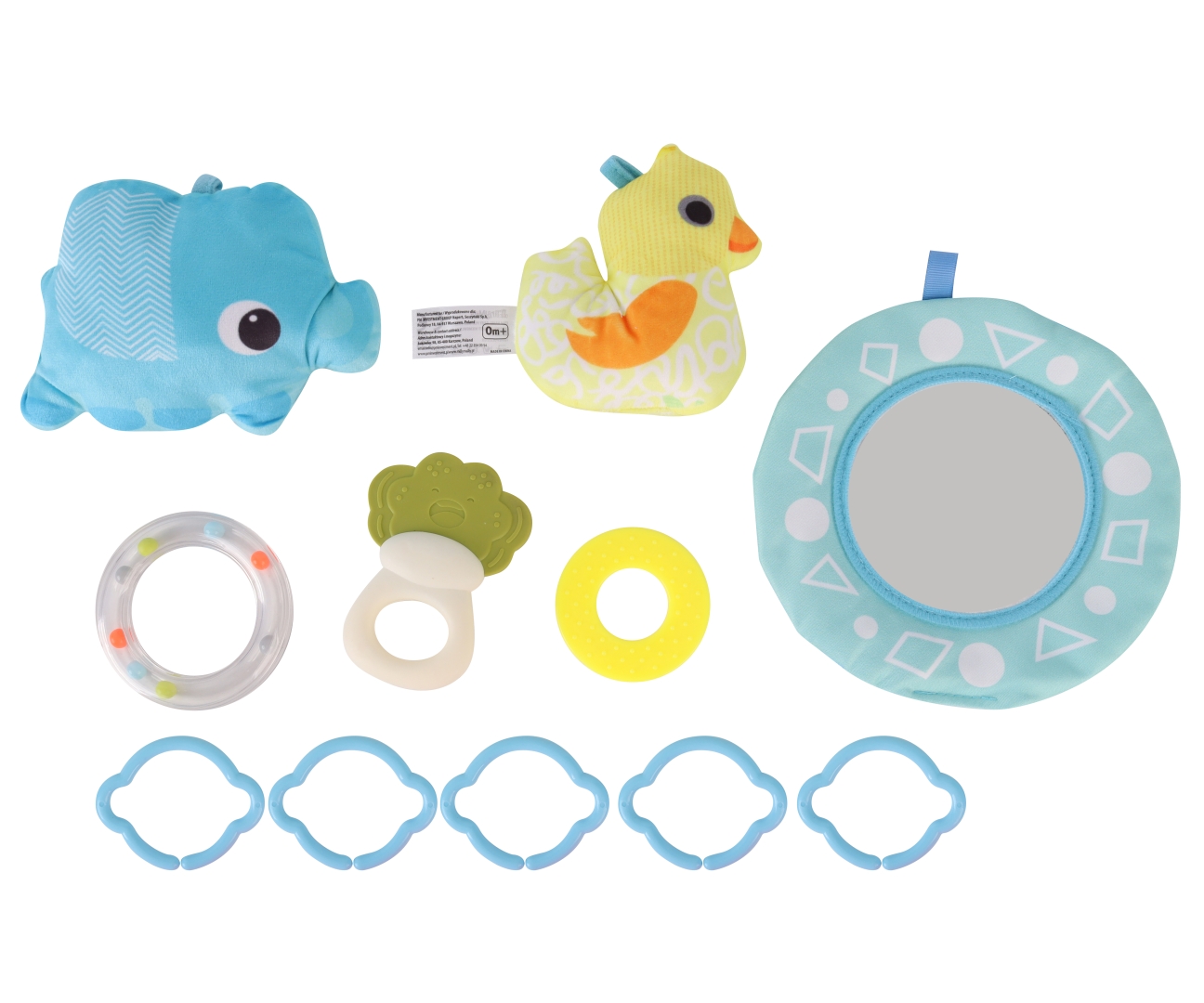 Zabawki można łatwo przepinać lub odczepiać – każda z nich posiada elementy dźwiękowe, dotykowe i wzrokowe, które rozwijają zmysły dziecka.