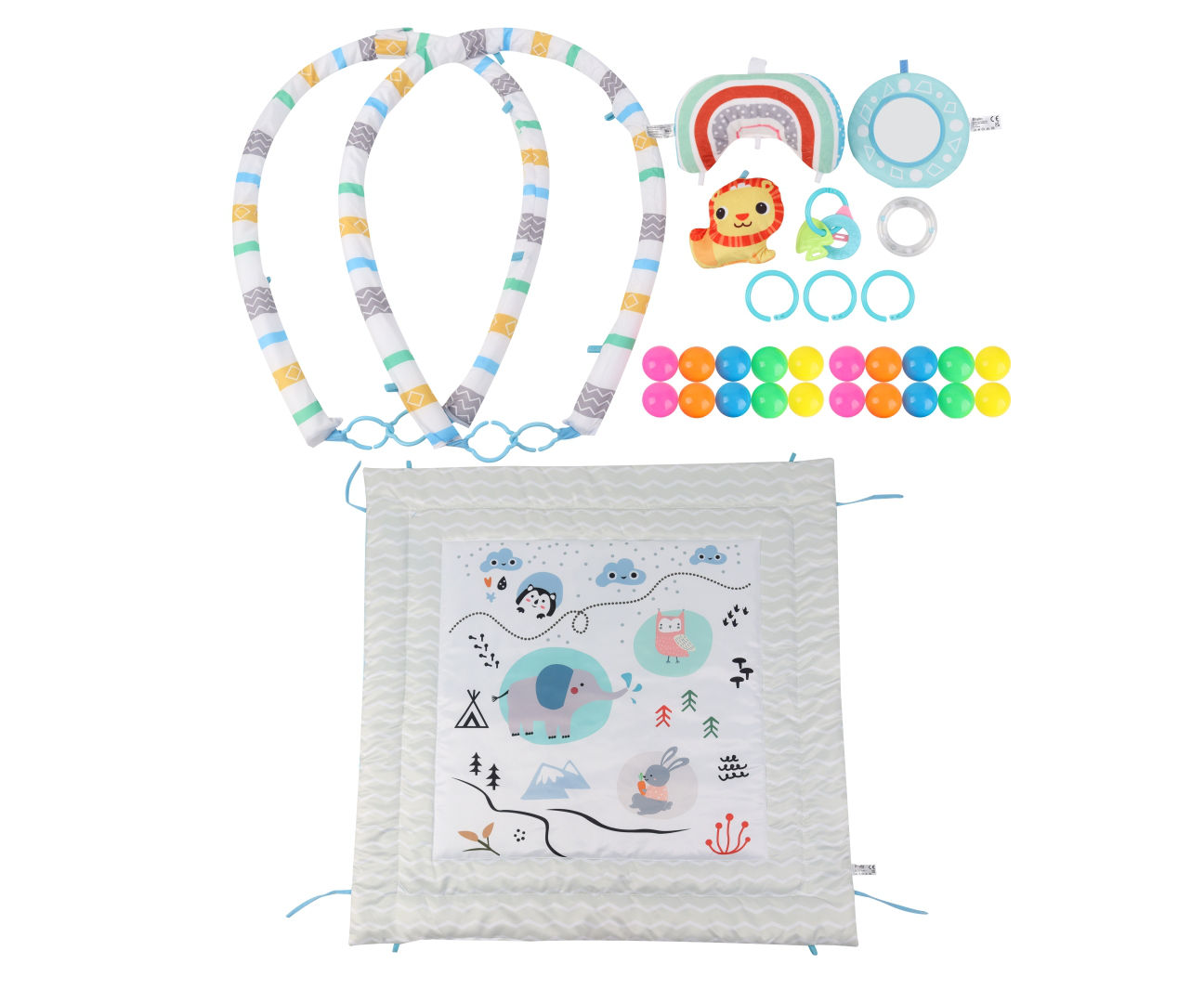 Mata TinyMini JL656-2A Mata edukacyjna 2w1 Zabawa w Górach to pięknie zaprojektowane, edukacyjne narzędzie rozwoju dla niemowląt – łączy zabawę, wygodę i bezpieczeństwo. Kolorowe zawieszki, łatwość czyszczenia i możliwość modyfikowania konfiguracji czynią ją wartościowym wyposażeniem dziecięcego pokoiku.
