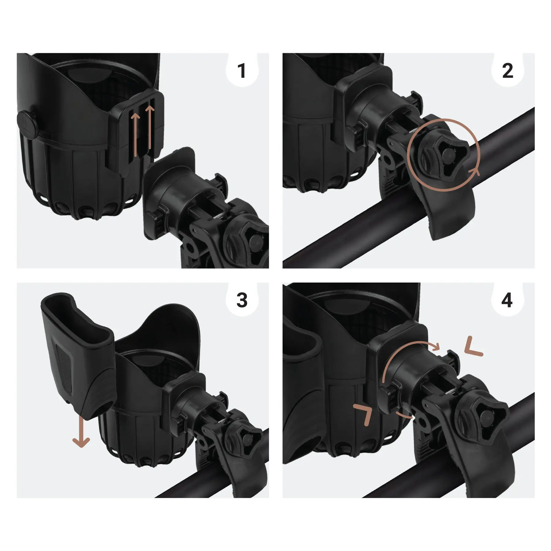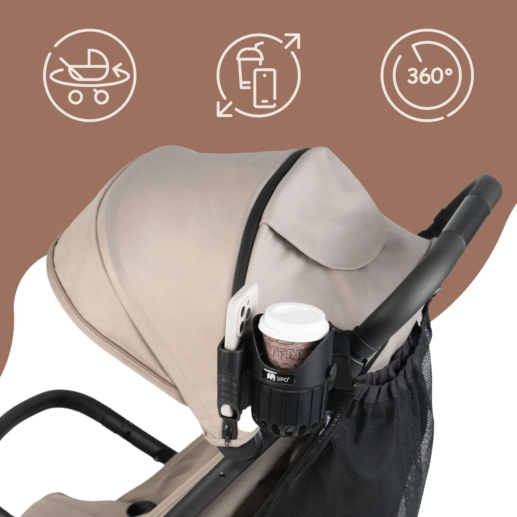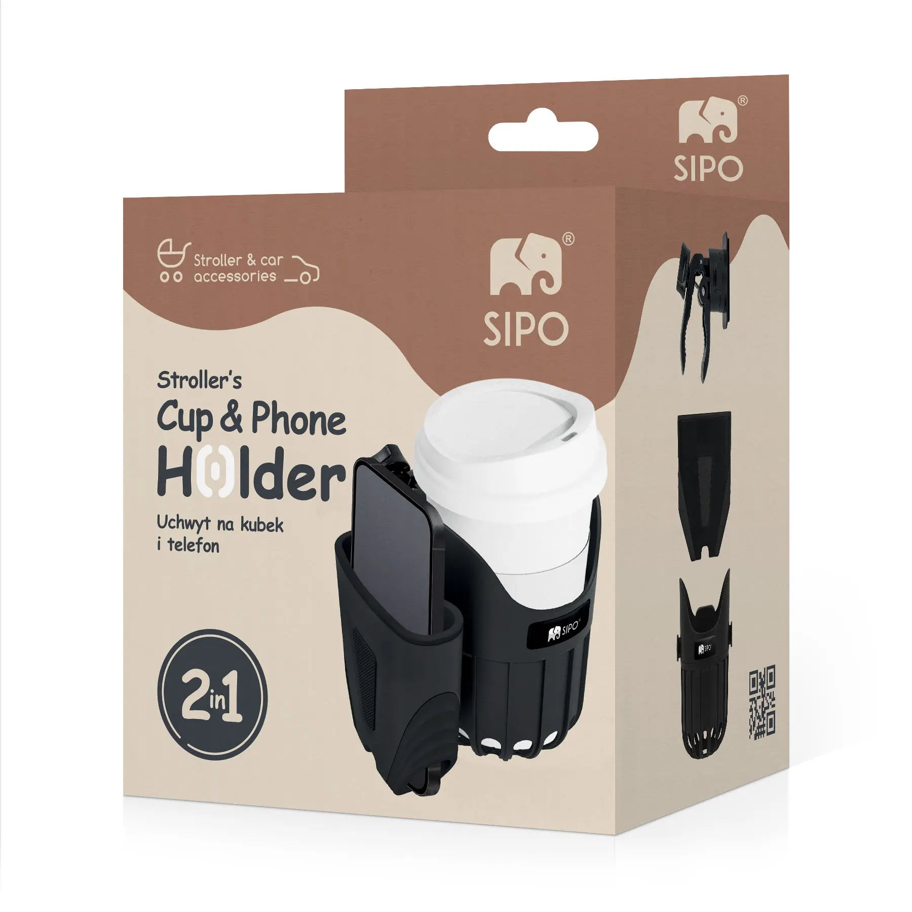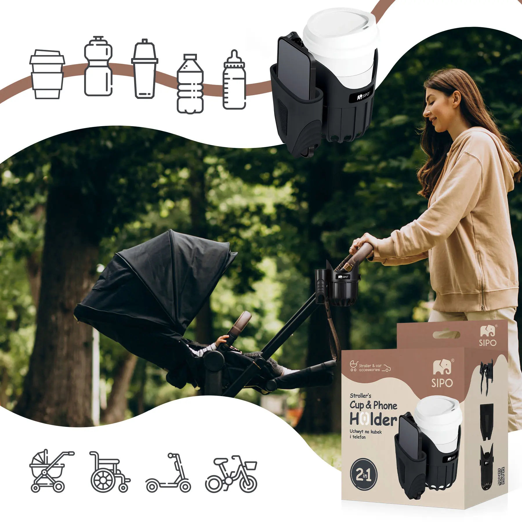 ✓ Konstrukcja 2w1 – uchwyt łączy dwie funkcje w jednym – stabilne miejsce na kubek oraz wygodny, zabezpieczony uchwyt na telefon umożliwiając bezpieczne i praktyczne użytkowanie podczas spacerów.