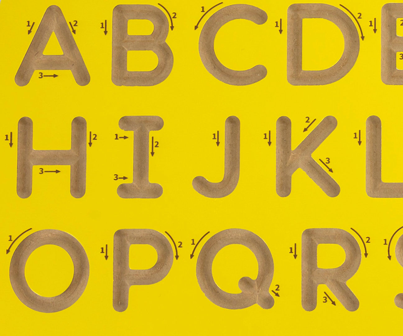 Sposób korzystania: Dziecko używa drewnianego pióra do prowadzenia po rowkach liter zgodnie z oznaczeniami. Dzięki intuicyjnym strzałkom i numeracji maluchy uczą się poprawnego kierunku pisania. Zabawa polega na śledzeniu kształtów liter, co wspomaga ich zapamiętywanie i późniejsze odtwarzanie na papierze.