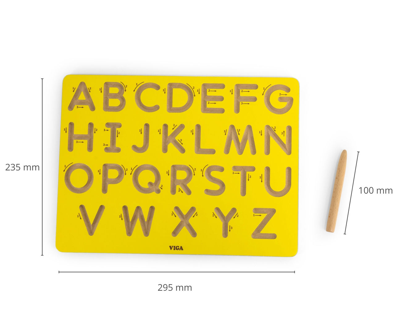 Drewniana tablica kreślarska od Viga to doskonałe narzędzie edukacyjne dla najmłodszych, które wspiera naukę alfabetu poprzez zabawę. Tablica o wymiarach 30 cm x 23,5 cm jest solidna i wykonana z drewna, a specjalnie wyprofilowane rowki w kształcie wielkich liter alfabetu pozwalają dziecku śledzić kształty liter za pomocą dołączonego drewnianego pióra. Każda litera posiada numery i strzałki wskazujące prawidłową kolejność ruchów, co wspomaga naukę pisania.