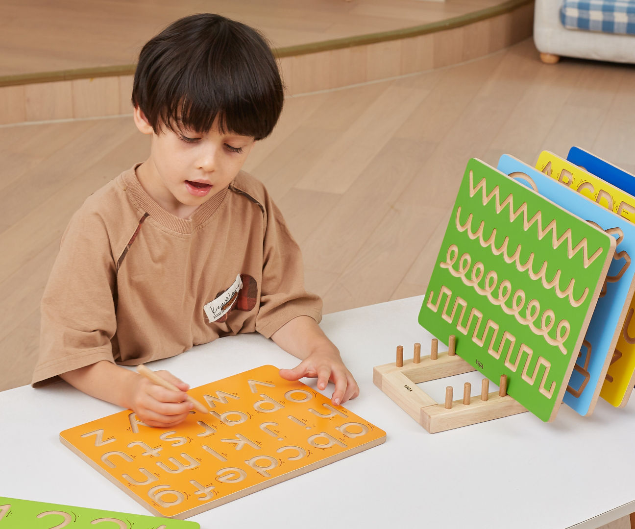 Sposób korzystania: Dziecko korzysta z drewnianego piórka do śledzenia wygrawerowanych wzorów na tablicy. Ruchy prowadzące po linii pomagają w nauce prawidłowego uchwytu narzędzia pisarskiego oraz ćwiczą koordynację ręka-oko. Śledzenie wzorów można wykonywać wielokrotnie, co pozwala na doskonalenie precyzji i płynności ruchów.