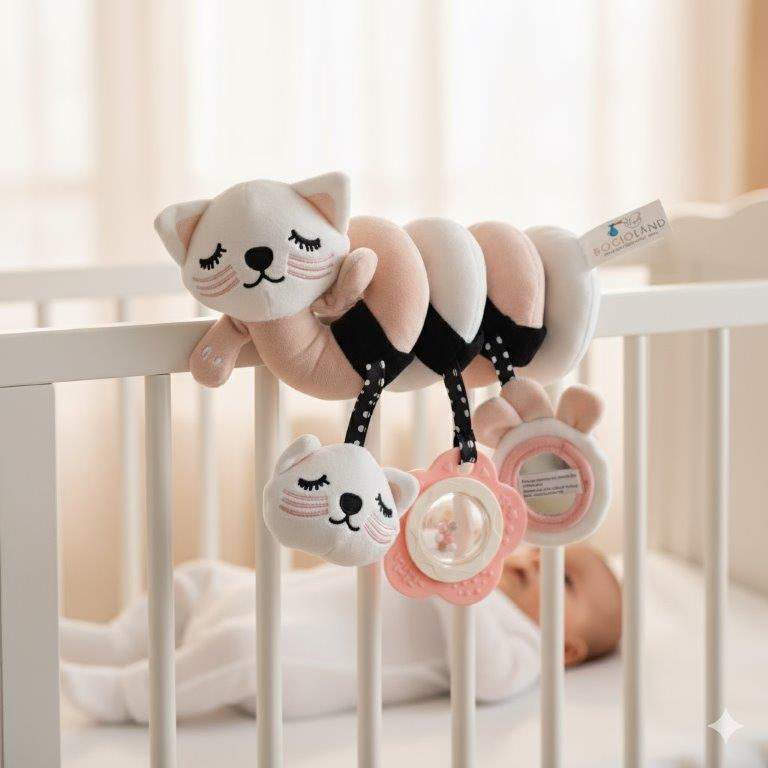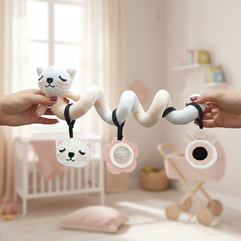 Bezpieczna. Miękka. Rozwijająca. Spraw, by każdy spacer i podróż były pełne uśmiechu – wybierz spiralną zawieszkę Kotek.