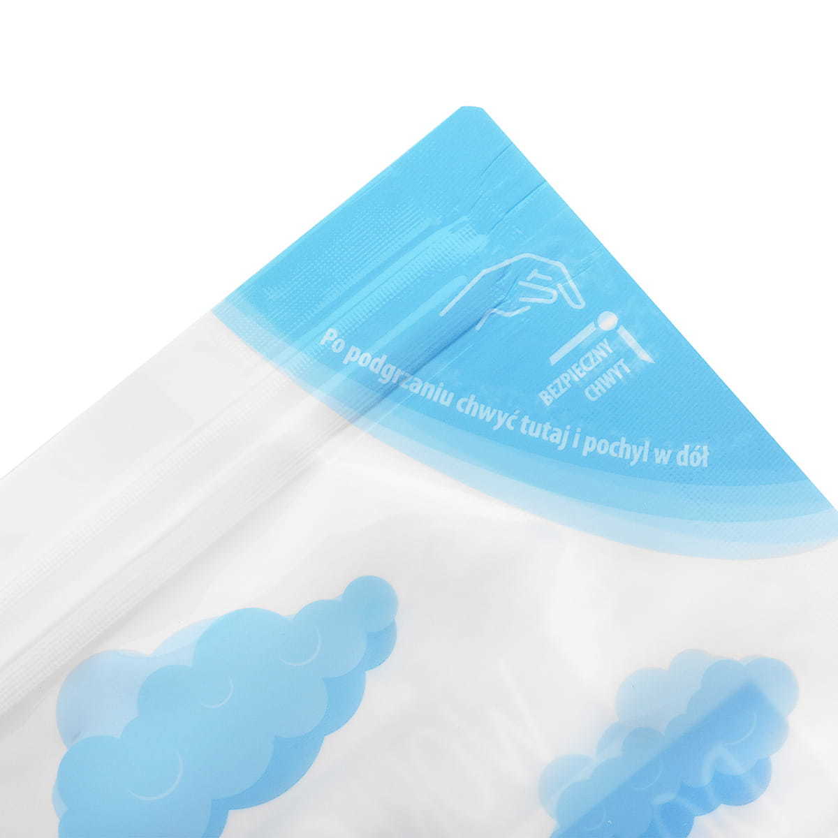 Uwaga! Na woreczku zaznaczone zostało miejsce, za które należy chwycić woreczek (prawy, górny róg). Para i woda po sterylizacji może być bardzo gorąca.