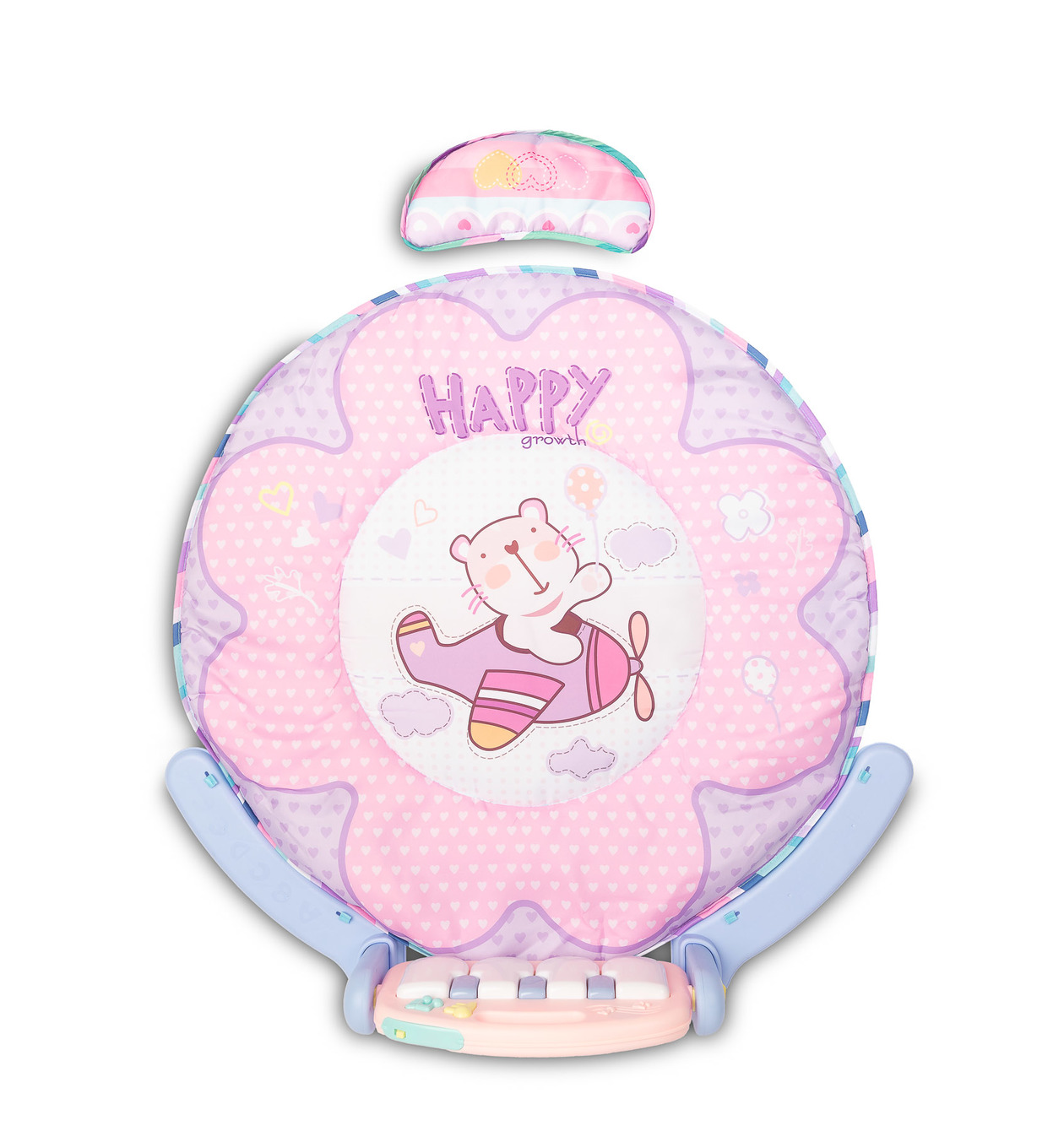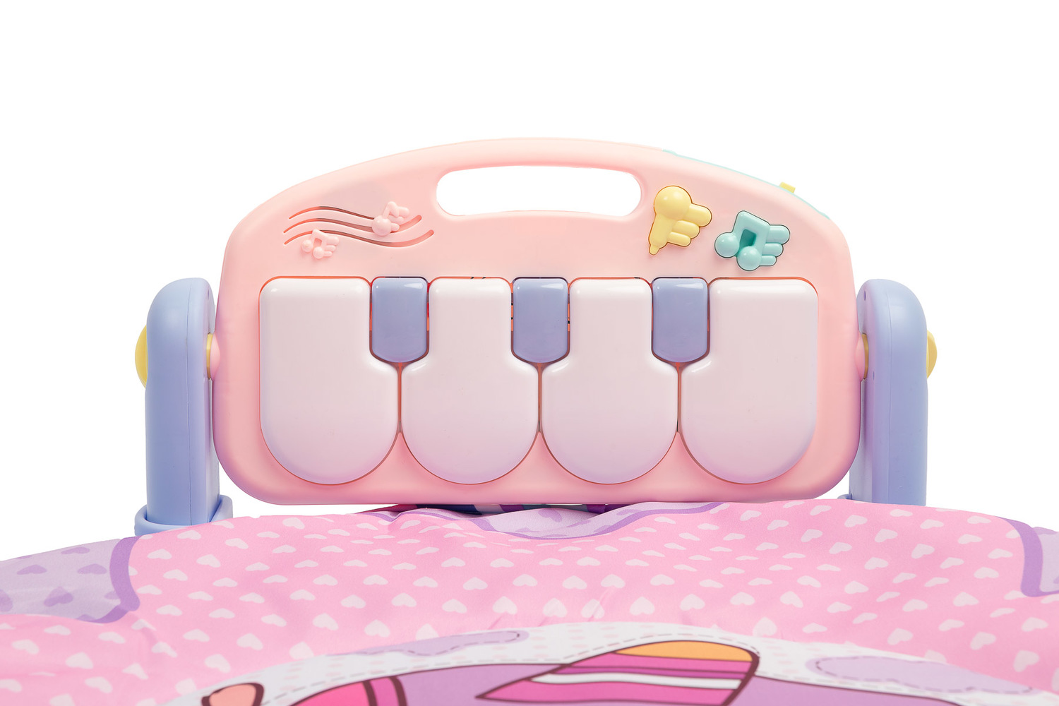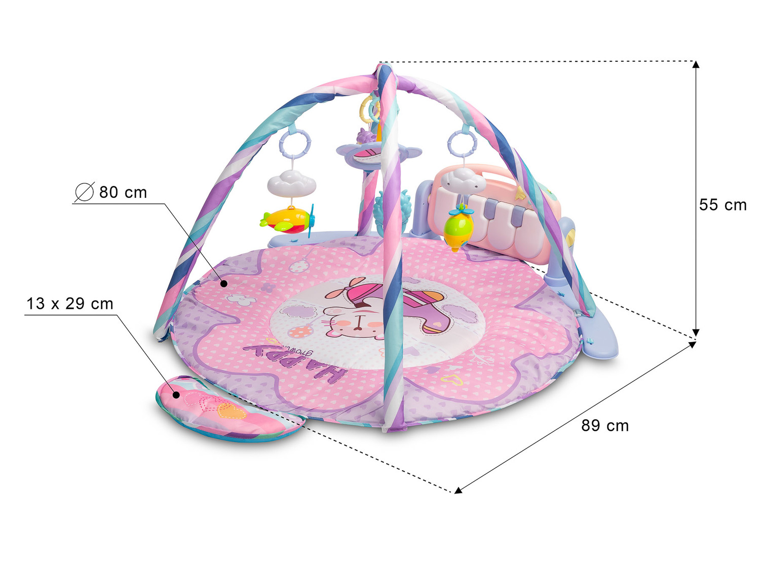 Kolorowa Mata muzyczna od Toyz to świetne miejsce do zabaw dla maluszków. Wykonana jest z łatwej w czyszczeniu tkaniny poliestrowej z miękkim wypełnieniem, które izoluje i zapewnia komfort. W zestawie znajduje się poduszeczka, która zapewni dodatkowy komfort zabawy w pozycji leżącej. Na pałąku zawieszone są zabawki sensoryczne, które stymulują rozwój dziecka i angażują jego uwagę. Największą atrakcją maty jest duża klawiatura muzyczna. Posiada cztery duże klawisze, które wydają dźwięki, a także przyciski zmiany ich brzmienia na 1 z 3 rodzajów. Wyposażona jest też w przycisk włączający delikatne melodyjki oraz 2-stopniową regulację głośności. Klawiatura jest zasilana 3 bateriami AA.